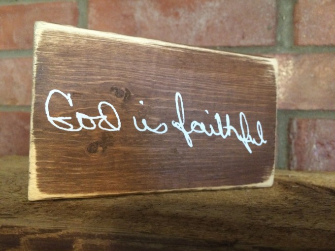 Weeks later I had three of her handwritten words carefully replicated and inscribed on a wooden block. It now serves as a reminder from my Mom, in her handwriting, on God’s faithfulness.
